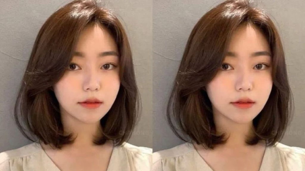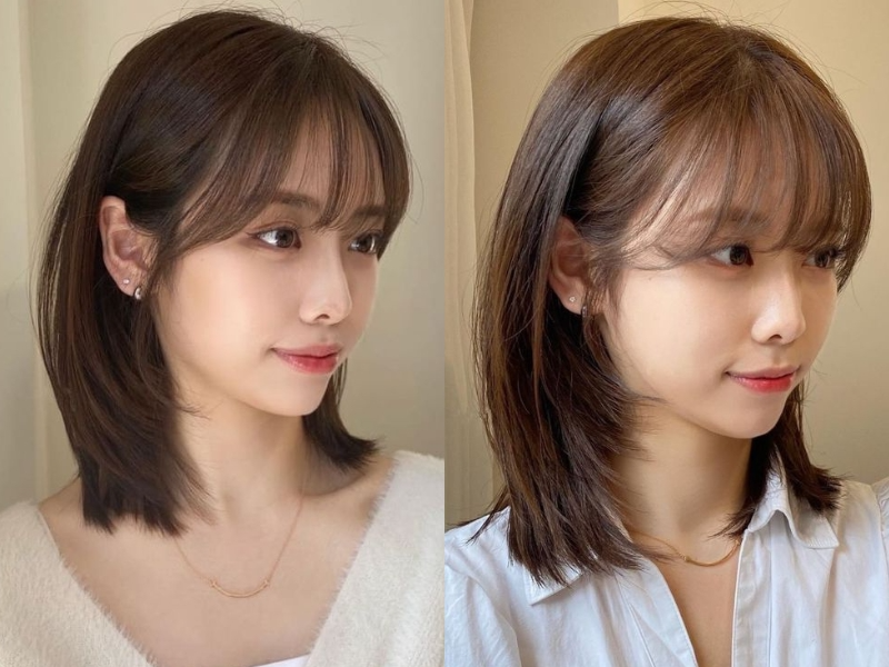 Thay thế: Tóc ngang vai tỉa nhẹ, mái thưa: Lớp cắt nhẹ giúp tóc phồng tự nhiên, phần mái mỏng che khéo vùng trán và làm gương mặt bừng sáng.