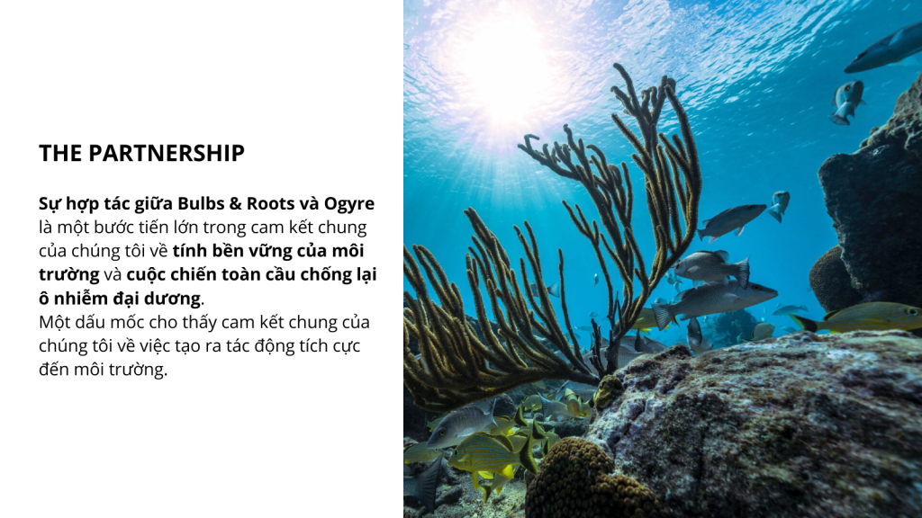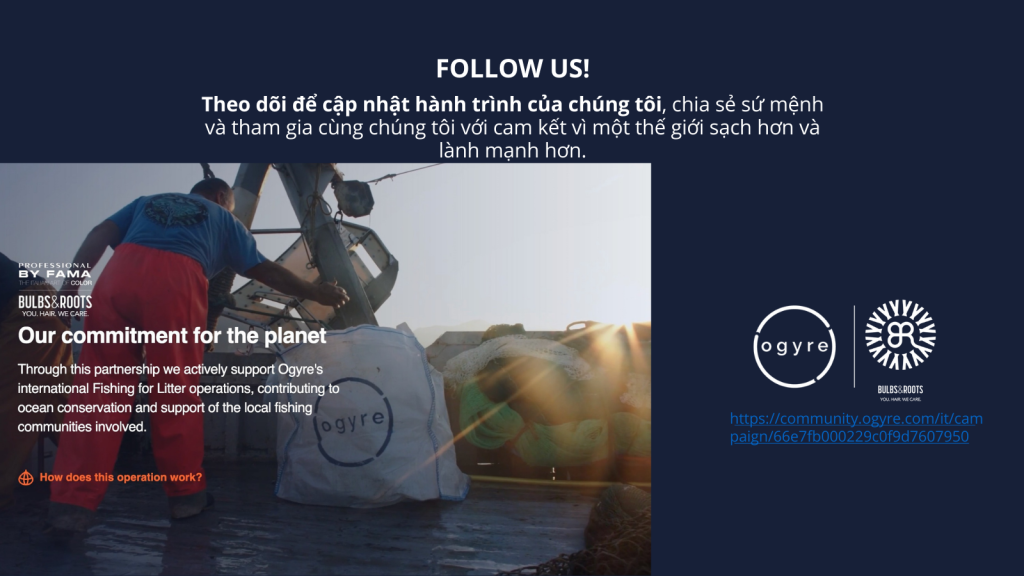 Với mục tiêu làm sạch đại dương và bảo tồn hệ sinh thái biển, Bulbs&Roots bắt tay cùng Ogyre (một startup công nghệ tập trung vào việc làm sạch đại dương) đã khởi động chiến dịch “Fishing for Litter” kéo dài ba năm, từ tháng 10 năm 2024 đến tháng 10 năm 2027.