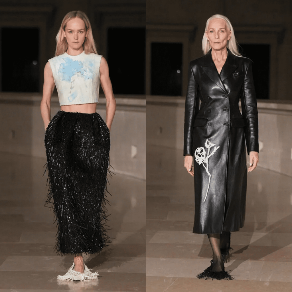 Không dừng lại ở bảng màu, Erdem tiếp tục kể chuyện bằng họa tiết hoa trừu tượng được thêu tay tỉ mỉ và in nổi trên nền cao su tổng hợp – chất liệu vốn ít được ứng dụng trong các thiết kế cổ điển. Túi xách, găng tay và phụ kiện cũng đồng bộ tinh thần thị giác ấy. Ngay cả những bề mặt đính sequin đen xù xì cũng trở thành điểm nhấn gợi mở một bản phác chưa hoàn chỉnh, đầy tính ám ảnh.