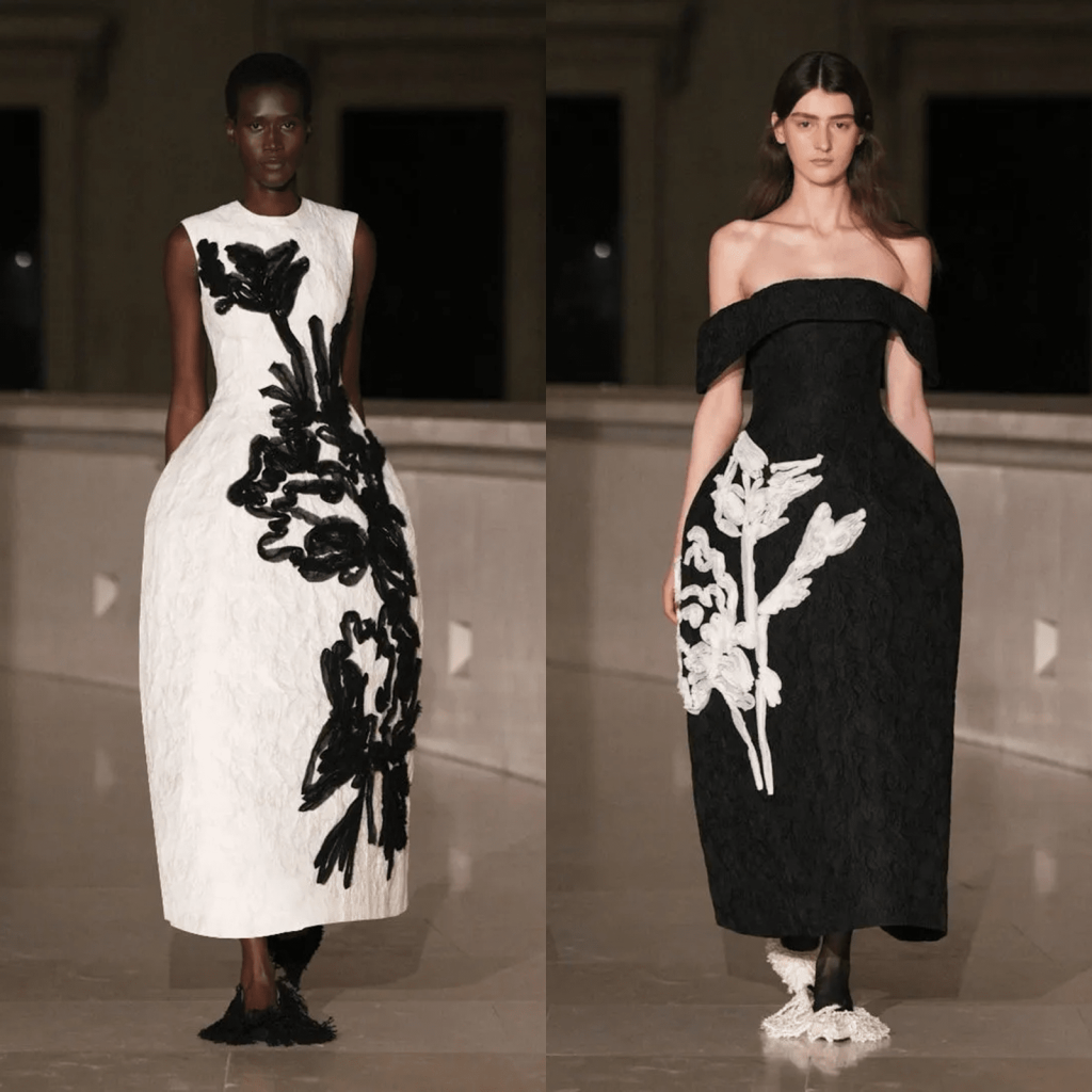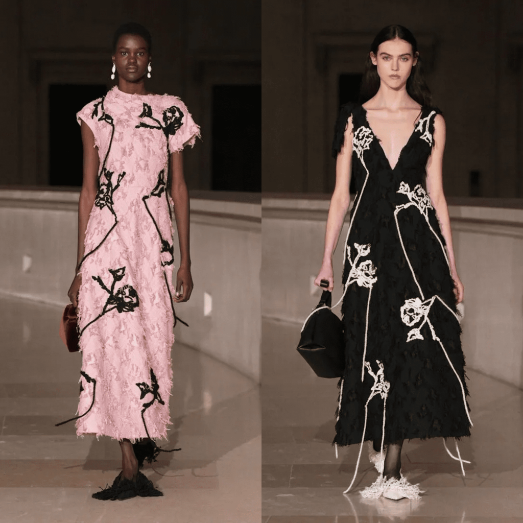 Không dừng lại ở bảng màu, Erdem tiếp tục kể chuyện bằng họa tiết hoa trừu tượng được thêu tay tỉ mỉ và in nổi trên nền cao su tổng hợp – chất liệu vốn ít được ứng dụng trong các thiết kế cổ điển. Túi xách, găng tay và phụ kiện cũng đồng bộ tinh thần thị giác ấy. Ngay cả những bề mặt đính sequin đen xù xì cũng trở thành điểm nhấn gợi mở một bản phác chưa hoàn chỉnh, đầy tính ám ảnh.